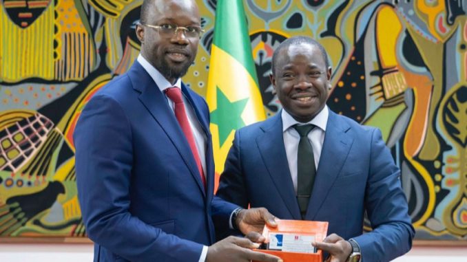 Le Premier ministre sénégalais Ousmane Sonko a reçu un échantillon de la première extraction de pétrole du champ de Sangomar, remis par le ministre de l’Énergie, du Pétrole et des Mines.